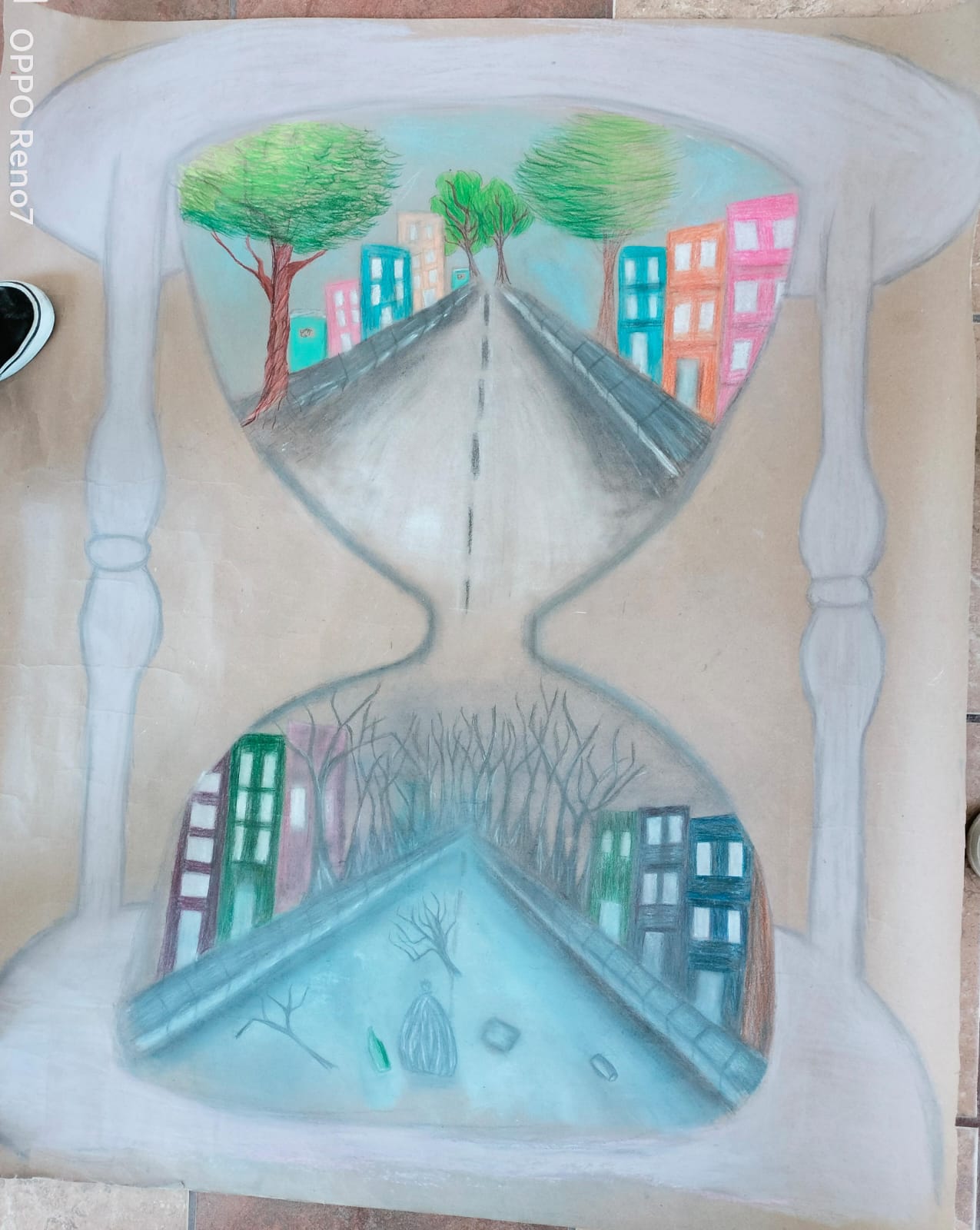 Una reflexión sobre el paso del tiempo y las consecuencias del daño ambiental. El dibujo muestra un reloj de arena, símbolo del tiempo que se acaba. En la parte superior izquierda se ve un paisaje colorido y vivo, con árboles verdes, cielo azul y edificios llenos de color; esto representa un mundo sano y equilibrado con la naturaleza.